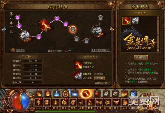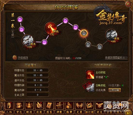 在37《金装传奇》中,图鉴积分通过击杀BOSS来获得,不同BOSS死后可以化为不同数量的图鉴积分。玩家利用这些积分成功激活技能属性点之后,还能获得对应的图鉴技能,一种是职业相关的主动技能,另一种则是召唤白虎、侠客等强力助手的召唤技能。
