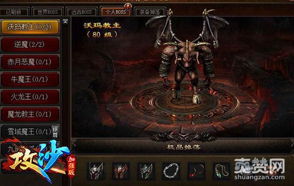 2、每名玩家每天都有若干次免费机会挑战个人BOSS,较低级的BOSS如沃玛教主、逆魔都有2次机会,而牛魔王、火龙王、魔龙教主、雪域魔王、九尾妖狐和巫妖王只有1次!