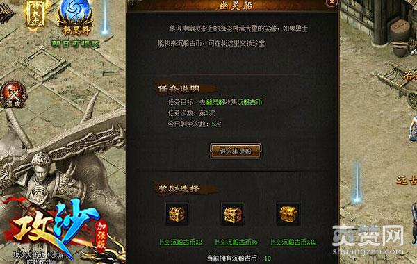 2、玩家在幽灵船中击杀幽灵海妖、龙虾守卫等海怪都有机会获得沉船古币。沉船古币可是个好东西,玩家可以收集古币到NPC出兑换不同种类宝箱,包括:沉船密卷宝箱、七海典籍宝箱、上古天书宝箱。玩家开启宝箱可以获得技能残页、经验葫芦等宝物。