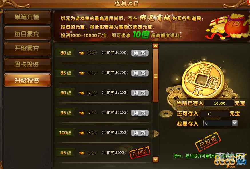 玩游戏升级很重要,那么在新热血江湖中需要怎么做才能快速升级呢?升级投资是游戏中比较高级的投资方式,我们在游戏中投资的元宝全部都能转换成高额绑定元宝,在游戏中使用绑定元宝在绑定商城中同样可以购买非常多种的道具。