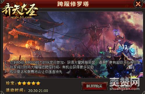 51《齐天大圣》跨服修罗塔每天晚上20:30~21:00开启,玩家达到85级且战力18000以上即可参加,挑战成功可以获得大量跨服荣誉和道具奖励。