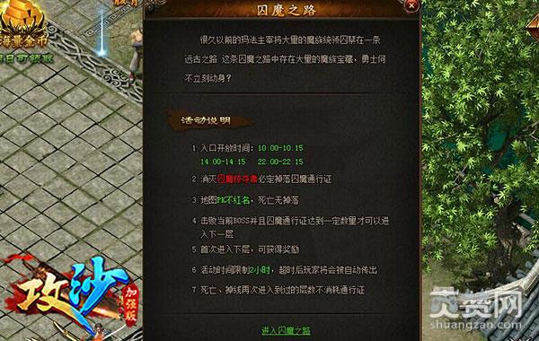 囚魔之路作为一个日常玩法,每天的10:00-10:15、14:00-14:15和22:00-00:15开启入口。一旦错过入口开放时间,玩家们就只能等待下一个时间段才能进入!在囚魔之路中,玩家可以击杀魔族BOSS获取极品高转装备、海量金币和大量的材料道具!