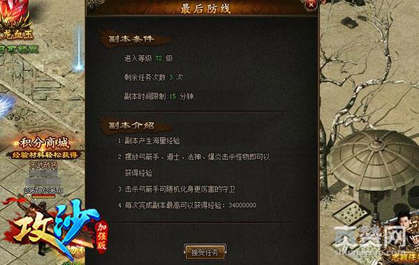 玩家只要满足72级就可以激活最后防线,推开经验玩法的崭新大门!一次活动可能不够过瘾,所以每名玩家每天都有3次机会挑战最后防线副本!作为全天候日常,玩家们可以选择方便的时间进行无人打扰的挑战!