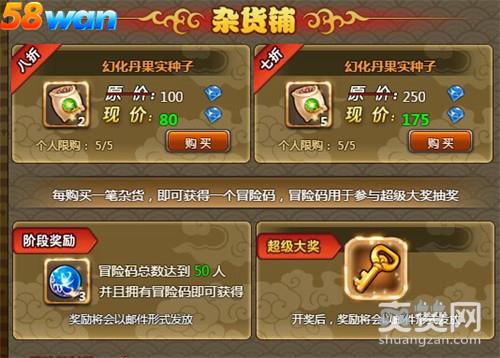 玩家在冒险集市的杂货铺每购买一笔杂货,那么就可以获得一个冒险码,冒险码可以用来参与超级大奖抽奖,幸运玩家即可获得超级大奖.冒险码总数达到1,幸运儿人数提升至1;冒险码总数达到10,幸运儿人数提升至2;冒险码总数达到25,幸运儿人数提升至3.在杂货铺购买的玩家越多,那么幸运人数越多.