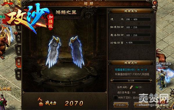 2、穿戴攻沙翅膀将为大家带来属性加成,高级翅膀加成更给力。