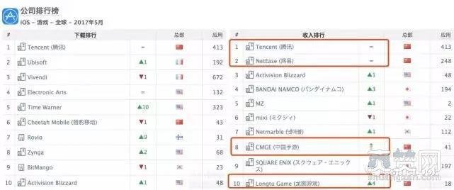 据App Annie的数据,5月份,国内公司在全球iOS发行商收入榜Top 10的数量增加到了4个。五月全球iOS发行商收入榜前十依次是:腾讯、网易、动视暴雪、万代南梦宫、MZ、mixi、Netmarble、中手游、Square Enix和龙图游戏;全球iOS手游收入榜Top 10分别是:《王者荣耀》、《梦幻西游》、《皇室战争》、《怪物弹珠》、《FGO》、《倩女幽魂》、《部落冲突》、《神话永恒》、《糖果传奇》和《天龙八部》。