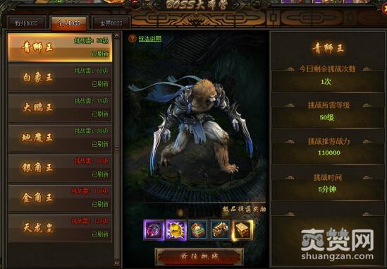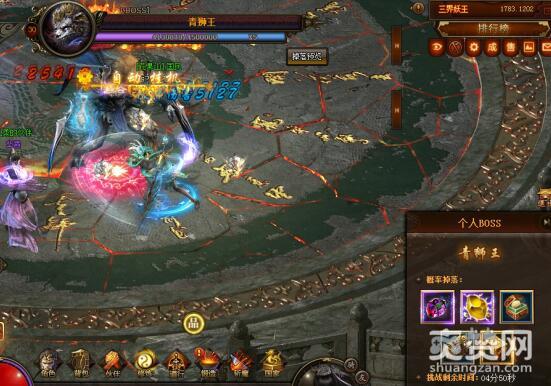 先看最菜、等级最低的青狮王,450万的生命值不容小觑,小编手起刀落还是需要数分钟才能将其降服。千万别忘记挑战BOSS有一定的时间限制,几分钟的时间需要玩家好好把握。看看右侧金光闪闪的宝箱,一猜就是好东西,别犹豫凭实力去拿回来吧。