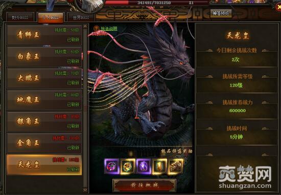 120级的天龙皇是目前傲天西游之路个人BOSS中最牛逼的BOSS。系统建议的战力为60W,消灭它的时间只能在5分钟以内。当你看着底部金光闪耀的宝贝,你是否已经按捺不住自己的内心了呢?赶紧去升级、提升战力再来会一会它吧。
