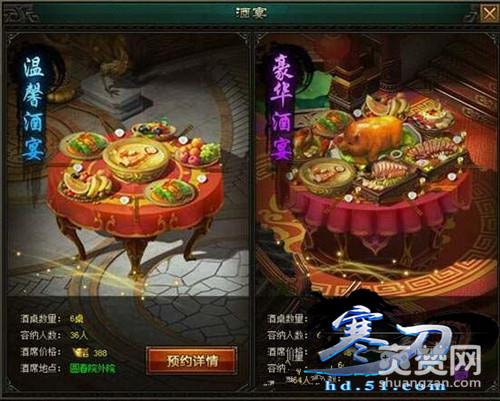 豪华酒宴:8桌容纳人数64人,需要388元宝,酒席地点在圆春院内庭。豪华酒宴新人可以获得永久结婚套装。
