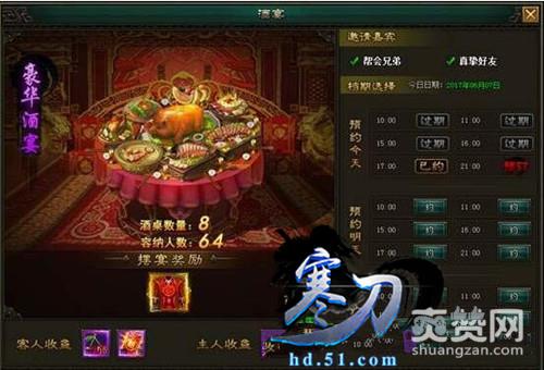作为刷气多金的你,准备和你的另一半私定终身时,是不是想给她一个盛大难忘的婚礼呢?让你们的三姑六婆参加你们的酒宴,鉴证你们的爱情!快去看看吧!51《寒刀》游戏中,玩家们结婚之后也可以举办酒宴了哦!!