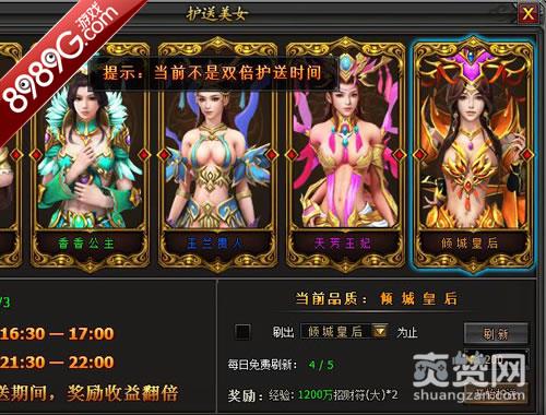 在8989G《无双》里有云华公主、香香公主、玉兰贵人、天芳王妃、倾城公主五位美人任君选择,护送等级品质越高的美人所获得的经验奖励也会相应的增加,每天护送三次每天有5次免费的刷品质的次数,当免费次数用完了玩家也可以使用200绑元刷新哦!