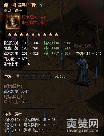 在孔雀明王套装中存在的道士职业的孔雀明王鞋,物理防御和魔防防御都会增加198-394,道术攻击201-329,与此同时,强化等级越高,属性增加的也就越多,玩家也可以进行装备淬炼哦,还等什么,赶紧来萝卜玩传奇皇朝获得这么给力的套装吧!
