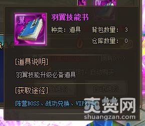 三、羽翼技能:技能可以消耗“羽翼技能书”提高等级,增加大量属性,或者增加特殊效果。该道具可以通过日常任务、兑换、阵营BOSS、VIP礼包获得、