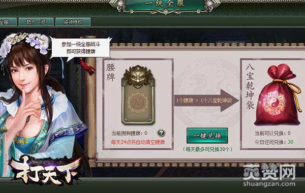 玩家在一统全服战斗中,击杀其他玩家就可以获得腰牌,活动结束后兑换腰牌可以得到八宝乾坤袋!每个八宝乾坤袋可以开出一个随机宝物碎片!击杀玩家不仅能收获刺激的PK快感,还可以兑换获得每天最多30个的八宝乾坤袋,你就说强不强?!!