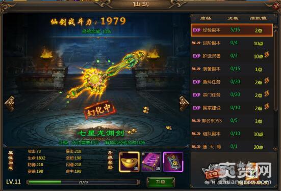 不同的任务奖励不同的活跃值点数,比如猎魔任务完成后可以拿到20点的点数,收集点数可以直接升级神剑等级。傲天乾坤战纪中神剑升级可以提升攻击、生命、防御、穿透、暴击、坚韧、闪避、命中八大属性加成,小编升级到了七星龙渊剑,战力总体接近2000。