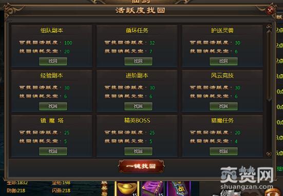 如果实在没有时间完成,又想升级那就只能选择“一键找回”,可以找回未完成任务的活跃值点数。但有一点,你必须多准备一些元宝来傍身。其实傲天乾坤战纪小编并不建议有时间玩游戏的小伙伴如此,时间充裕一定要多玩多做任务,积累活跃度来提升神剑的威力。如果时间不够多,一开始进去就捡活跃值最高且比较容易的做,这样就可以尽早收获高活跃值。余下的即便是花点元宝去找回,总的来说也比较少非常的实惠。