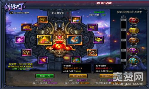 4366《剑倚天下》的神奇宝藏设有12种宝藏,分别有90级金色进阶装备、火色玄狐幻化卡、90级橙色进阶装备、五行之力宝箱、三级丹药礼盒、魔族强化令、仙侣强化丹、随机技能书礼盒、被动技能书礼盒、铜钱卡、二级宝石礼盒和装备强化石。各种装备、道具满足你的所有需求!