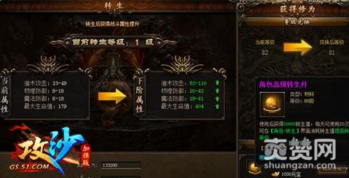 传奇游戏中转生意味着了打开了更精彩的游戏大门,不仅实力将实现质的跨越,还能接触到游戏内最核心的玩法。在51《攻沙》游戏中,许多活动玩法都设定了转生门槛,意味着玩家必须转生才能参与,并且转生后就能穿戴极品转生装备,开始走向强者进阶之路,转生后还将享受专属的转生副本,转生等级越高,加成越给力。