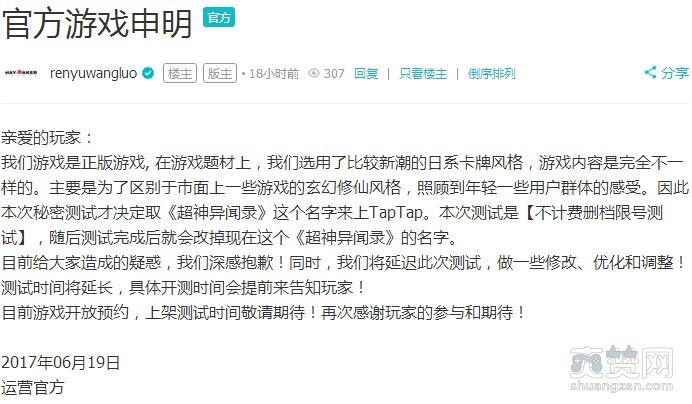 对于这些批评,开发商表示《超神异闻录》是一款“正版游戏”,由于要与市面上玄幻修仙风格游戏做出别,并且照顾到年轻群体的感受,本作本作是比较新潮的日系卡牌风格,游戏内容是完全不一样的。同时“超神异闻录”并不是游戏的最终定名,游戏在测试完成后将更改名称。