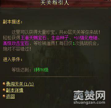 勇闯天关副本中一共有40层,每一层都有一个相应的boss。在每一层中, 玩家都有五分钟的挑战时间,不管是被boss击杀还是超时,任务都算失败。当然,玩家若击杀了boss,就可用黄金铲子来挖掘boss尸体,这样就有可能有意外收获哦!像神戒、金币和珍稀道具等,都不在话下哦!
