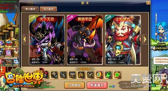 想要前往副本,先要在《冒险世界ol》游戏中的各大主城中找到中转副本传送员田豫,传送进入中转地图。在中转地图中,可以看到所有副本的指引NPC,多人副本有:40级竹林试练、50级救援吕布、60级巨石迷阵、70级海底探险、80级毒窟擒王、90级赤壁之战、100级魔化之心、110级孔明试练、120级天下无双、130级黑暗军团、140级火焰禁地。