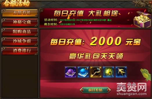 活动内容:合服活动前三天,每日充值2000元宝即可领取每日豪华大礼包!