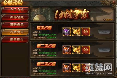 活动内容:合服活动三、五、七日,获得沙城行会,分别每次获得1W元宝、1W元宝、2w元宝、会长额外获得极品首饰盒以及300攻击沙城专属BUFF!