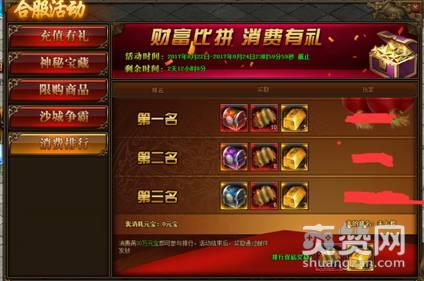 活动内容:合服活动前三天,满30万元宝即可参与排行、第1名洪荒首饰箱*1,技能书卷*10,金条(300w)*5/第2名魂装首饰盒*1技能书卷*8,金条(300w)*4/第3名巅峰首饰盒*1技能书卷*6,金条(300w)*3;另外保底奖励技能书卷*4,金条(300w)*2