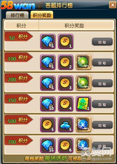 玩家在查看奖励界面的积分奖励面板上就可以领取奖励了,每档奖励每场活动只可以领取一次.千万要注意的一点是,每一场的积分和领奖状态都会在下一场答题活动开始前清除,所以一定要及时兑换,否则只能白白浪费积分.最强大脑奖励丰富,绑钻、金币、幻化丹和钻石等等你来领!