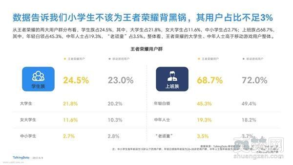 TalkingData的《王者荣耀热点报告》显示: 《王者荣耀》主要可以分为“学生族”和“上班族”两大群体,学生用户在总用户群中占比为24.5%,上班族占比则为68.7% 。而在24.5%的学生用户中,大学生占比高达21.8%,中小学生只有2.7%。