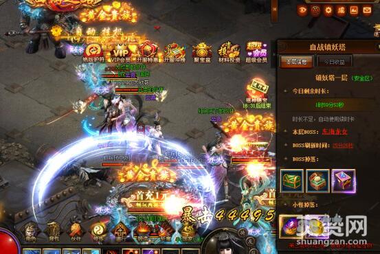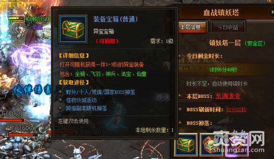 以上是第一层的情况,每层都会有一个BOSS,能看到小怪以及BOSS掉落的奖励,非常的丰厚。镇妖塔第三层的PK区,专门刷新2~5倍经验怪物,想要经验值爆棚又有绝对实力的傲天西游之路小伙伴不妨进入第三层PK去赚取大把经验值,继续往上努力吧。