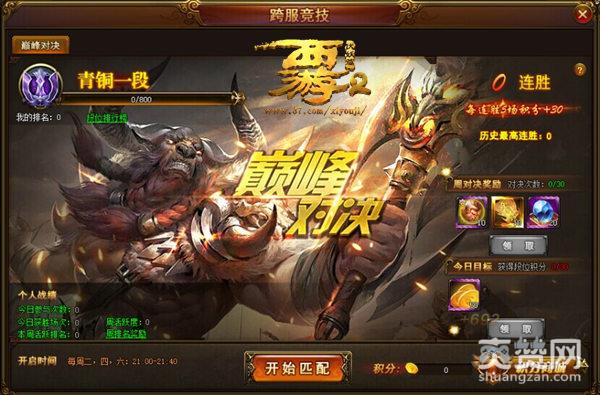 37《西游伏妖篇》跨服竞技将于每周二,四,六晚上的21:00-21:40这个时间段进行,在活动时间内点击【跨服竞技】的图标即可参与活动,巅峰对决为1v1跨服竞技,玩家点击开始匹配,系统将帮你自动寻找与自己段位差距最近的其他玩家。