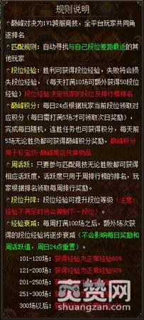 37《西游伏妖篇》跨服战段位经验可以提升段位等级,经验不满足时将会调到下一段位,每周打满100场之后,额外场次获得的段位经验将会逐步衰减,每周活跃度达200以上即可入榜单,排名越高,则奖励越丰富,巅峰积分可用于珍宝坊-巅峰商店兑换道具。