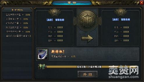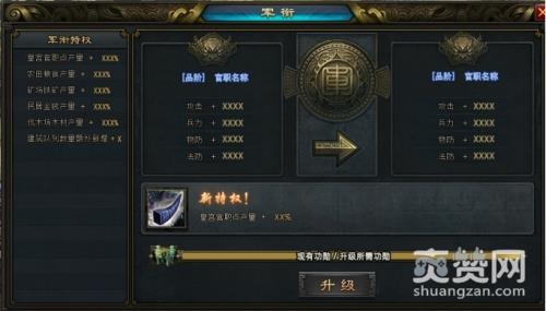 军衔系统提升军衔需要使用功勋,功勋是来自于城战中的战斗,当主公的现有功勋达到了升级所需要的功勋时,就可以完成军衔的提升了!升级后的军衔不仅能够为主公提供更加酷炫的军衔称谓,而且能够获取更加丰富的军衔特权。