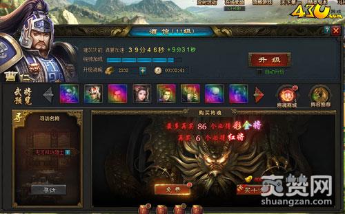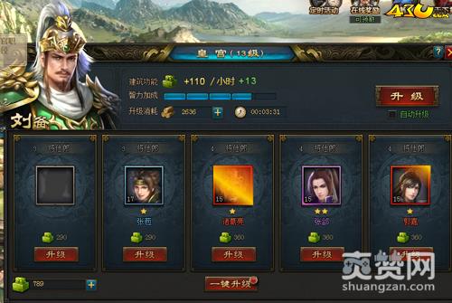 在43u《烽火燎原》中,在线时间越长可领取的神将越多哦!例如:诸葛亮、刘备、黄盖等等,每每达到相应得等级会可获得等级奖励,在43u《烽火燎原》中可是不存在挂机飞速升级的,在这里,一切都靠手动操作,玩家可以自己建皇宫、兵营仓库、铁矿、铁匠铺、管理居民、开酒馆、开垦农田、集市收税等等。添加武将驻守还可增加收益哦!