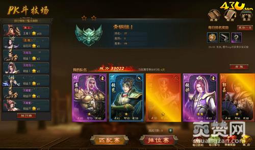 43u《烽火燎原》斗技场为跨服战斗,在这里玩家可以和全服的所有玩家进行战斗,在斗技场中,双方将进行战力平衡,击败对手所有武将将获得胜利,玩家们还可选择匹配赛和排位赛来进入战斗,排位赛赢一场获得一颗星,反之则扣一颗星。其中匹配赛战斗结果是不会改变段位星数的哦!
