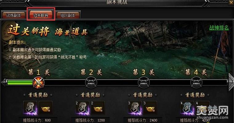 之后说一下过关斩将这个副本,还是老规矩点击一下按钮进入过关斩将页面。要注意的是,这个副本每天重置一次,并且奖励分为首通奖励和扫荡奖励。关卡数排名第一的玩家会获得战无不胜的称号哦。通关后的关卡,在第二天可直接扫荡,并获得海量经验和铜钱。点击继续X关按钮进入副本,屏幕右侧会显示通关后获得的珍贵道具,声望令牌和绑定元宝。小伙伴们要注意的是,在每个副本党总的每个BOSS都有挑战时间限制,如果超过时间的话,后果非常严重,是会直接挑战失败的!所以我们一定要把握好时间,在挑战成功之后,玩家会额外奖励经验和铜币,这个时候玩家可选择继续挑战和退出副本。如果不做选择的话,那么会在几秒后自动进入下一个关卡。小编觉得过关斩将不仅是验证实力的地方,还是获得无限奖励的好场所,所以是每天一定要做的副本。