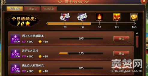 “每日必做”的栏目当中的任务是一定要做的,因为只要玩家每完成一个任务,那么就可以获得活跃度积分,并且如果积分每达到一定值的话,那么每天就能够领取一份活跃奖励,奖励当中除了常规的酒、银币、主角将魂这些资源道具外,还有非常多的VIP经验和系统元宝,小伙伴最好每天都要刷满,因为只要做日常,那么也可以提升VIP等级,享受部分VIP特权!