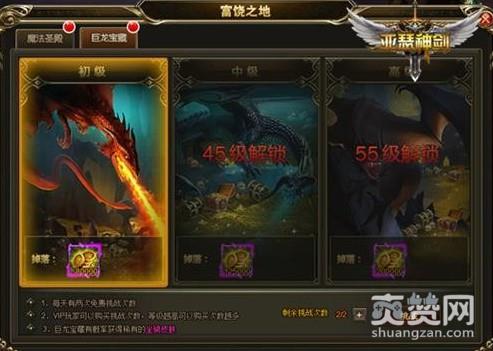 当然在亚瑟神剑的世界当中,巨龙之地并不是随便都可以进入的。所以《亚瑟神剑》巨龙宝藏玩法每天是有次数限制的,在每天当中,系统只为玩家提供两次免费的挑战机会。当然如果两次次数用完了之后,玩家觉得还打不过瘾的话,那么有VIP身份的玩家,还可以另外购买挑战次数,而且一般说来,等级越高可以购买的次数越多哦。