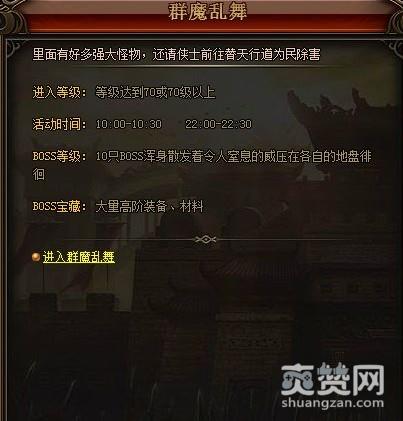 在秀丽江山的世界当中,有非常多的有意思的活动,其中小编觉得最好玩的是群魔乱舞活动。但是这个活动是有一定的等级要求的,只要等级达到70级以上才能够参与到这个游戏当中来。另外这个活动也并不是随时都可以进的,只要在10:00和22:00这两个时间点才会开启。并且每次开启的时间非常的短,只有30分钟。