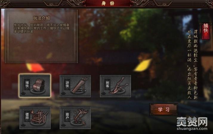 身份是一种较为休闲的玩法,帮助玩家在游戏中个性化发展的系统,玩家可以在一定等级后解锁该系统,然后在“捕快”、“游侠”、“刺客”、“镖师”、“猎户”五个职业中任选一个。选择身份会解锁相应的身份技能,且每个身份都会有1-2个专属玩法(单/多人PVP、PVE玩法),身份技能在特定场景或者任务下,会大大提升自身、队伍又或者盟会战的属性。具体的身份技能信息可以在游戏中的武学系统中查看。同时还会解锁一些制造技能,每个身份身份会解锁2-3个部位装备的制造。在之后满足某些条件后,还可以选择额外两个身份。