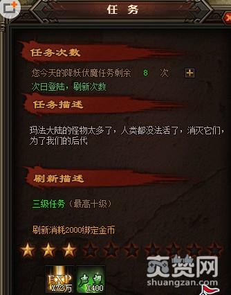 除魔任务为简单的杀怪任务,只要消灭指定怪物就可以快速完成啦。接取任务前,只要花费少许金币就可以刷新任务星级,星级越高,完成任务可以获得的奖励就越多,建议各个玩家最好刷新任务为满星后再接取。成功完成任务之后可以在除魔使者处交还任务,交还任务也可以花费少量金币多倍领取任务奖励,如果金币富足的话建议各位玩家还是3倍领取,可以获得大量经验与功勋值。