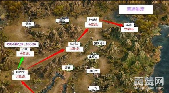 我们今天要说普通难度的。首先是代郡这个城要尽快打下来,点掉NPC事件后会增加全军战斗力,毕竟五星的关键就在于时间,部队实力越强,单挑所花费的时间越短,所以请直接进一武将放影子然后派两个武将再进去点单挑,剩下一个走陇西郡放影子,等代郡打下来并且事件点完之后,再派一个残血武将(为了尽快死回来节省时间)从陇西郡突进到武威放影子(注意,武威有三队敌军,如果自身武将实力较弱,就多放点影子,如果实力较强,放3~5个就可以了),而剩下的武将按照红色箭头标识继续打过去