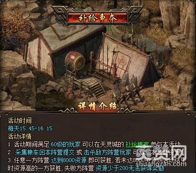 在每天下午的15:45-16:15,补给争夺活开启,60级的玩家可以在天灵城补给粮官处参与活动,系统将玩家随机分配成两个阵营。两组阵营都需要把散落在战场中间的粮车采集回自己的阵营,粮车刷出表示对抗赛开启!粮车采集完毕后会在4分钟内暂时改变玩家自身的外观形象并降低移动速度,这时需要团队的配合和掩护,在团队成员采集过程中保护好运粮者不被敌对阵营的击杀和破坏,阵营资源可通过在本阵营的军需官处上交补给或击杀敌方阵营玩家两种方式来增加;