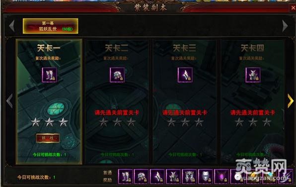 第一种:紫装副本,紫装副本每个角色生涯有且只有一次机会进行挑战,挑战完所有十一关副本可集齐一套紫色装备。第二种:战力副本,战力副本是三种副本中数量最多,玩法最丰富的类型,有单人副本也有组队副本,玩家通关这些副本可获得不同升阶系统的升阶道具,提升实力。第三种:经验副本,玩家每日可免费挑战2次,通关该副本可以获得海量经验,快速提升等级。