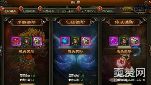 进阶副本:主要以进阶系统分别是坐骑、仙羽、侍从、灵骑、灵翼、灵武的进阶系统副本,通过便可获得大量道具。