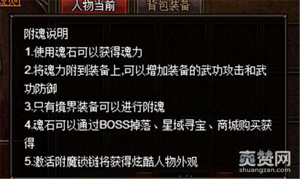当你拥有了境界装备后,便可进行附魂与魂力回收咯,简单的说一下,附魂可以将魂力附到装备上,可以增加装备的武功攻击和武功防御;魂石可以通过BOSS掉落、星域寻宝、商城购买获得;而且激活附魔锁链将获得炫酷的人物外观喔~
