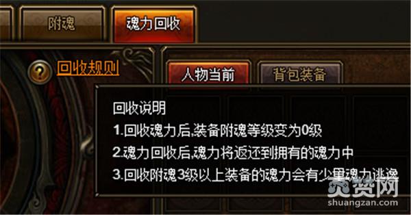 当你有认为这件装备不值得再继续附魂的话,这边系统也会设有魂力回收功能,这样能大大减少玩家的损失,是不是很人性化呀~但记住喔,回收魂力后,装备附魂等级将变为0级,且在回收3级以上的装备时,会有少量魂力会逃逸喔~所以玩家大大们还是要多考虑多思考喔~