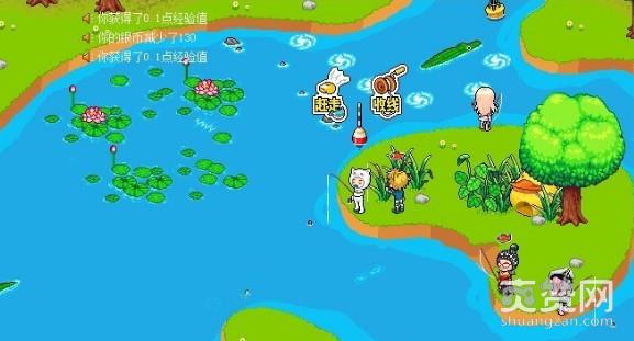 钓鱼嘛,也是有经验呢。当鱼上钩的时候你会发现那个浮标会动,这时要看仔细咯,上钩时,浮标轻轻向右摆动,那上钩的便是鱼宝宝或者一些道具宝石宝箱之类的。(鱼宝宝可以放生,有一定几率获得皮皮果或卡卡果){皮皮果增加50经验5点技能}{卡卡果增加500经验50点技能}。