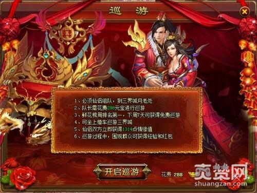 仙侣可花费元宝进行巡游,获得大量情缘值,仙侣双方坐上双人龙腾坐骑巡游三界城,围观群众可获得经验和红包